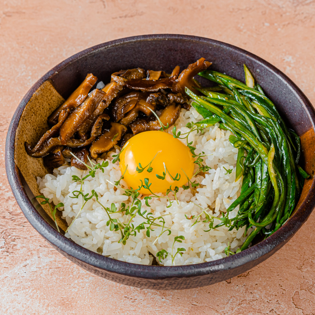 Свинина, шиитаке, яйцо, рис, лук порей, соевый соус