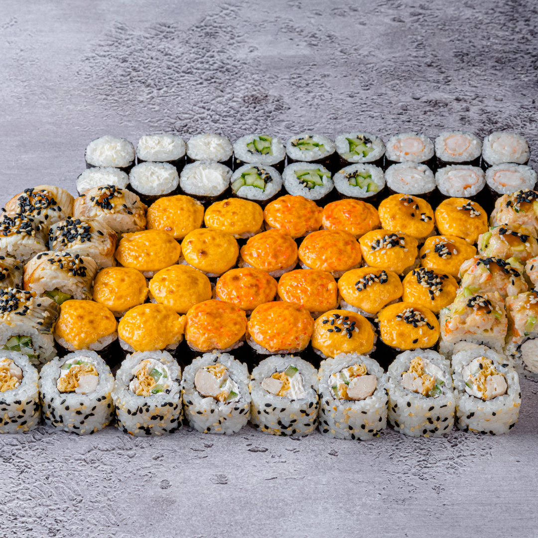 Запеченный с копченой курицей; Запеченный с сурими и тобико; Запеченный с окунем; Филадельфия с угрем; С тартаром из креветок; Осака; Маки с креветкой; Маки со сливочным сыром; Маки с огурцом (66 шт).