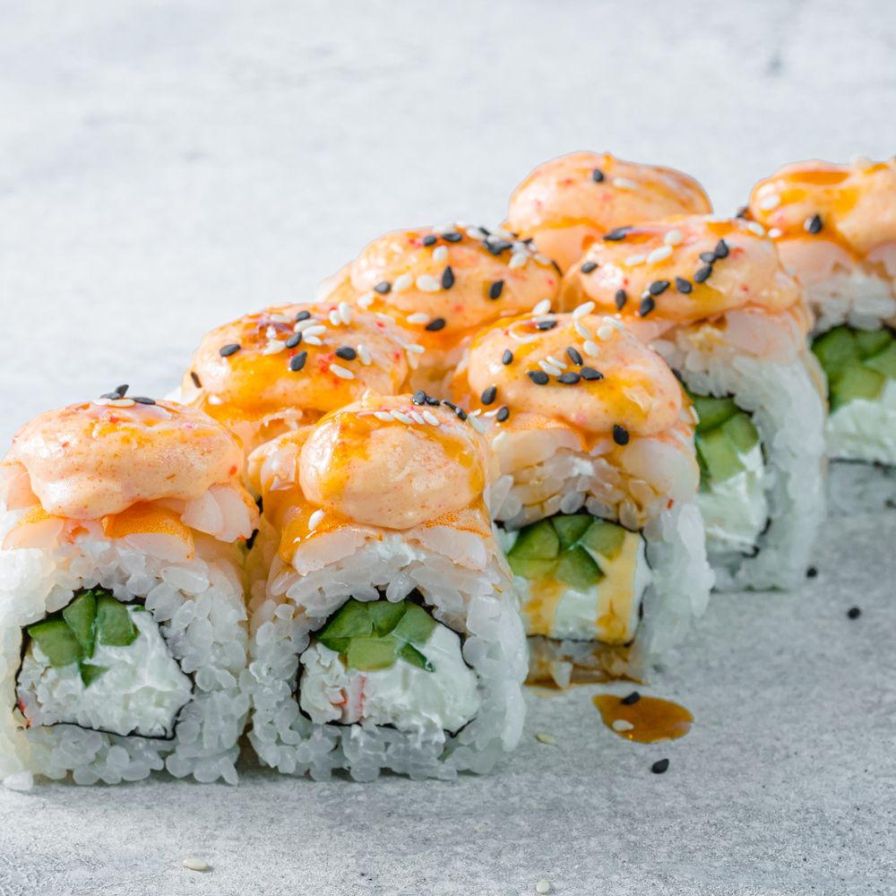 Креветки, сурими, огурец, сливочный сыр, соусы: для запекания с тобико, терияки