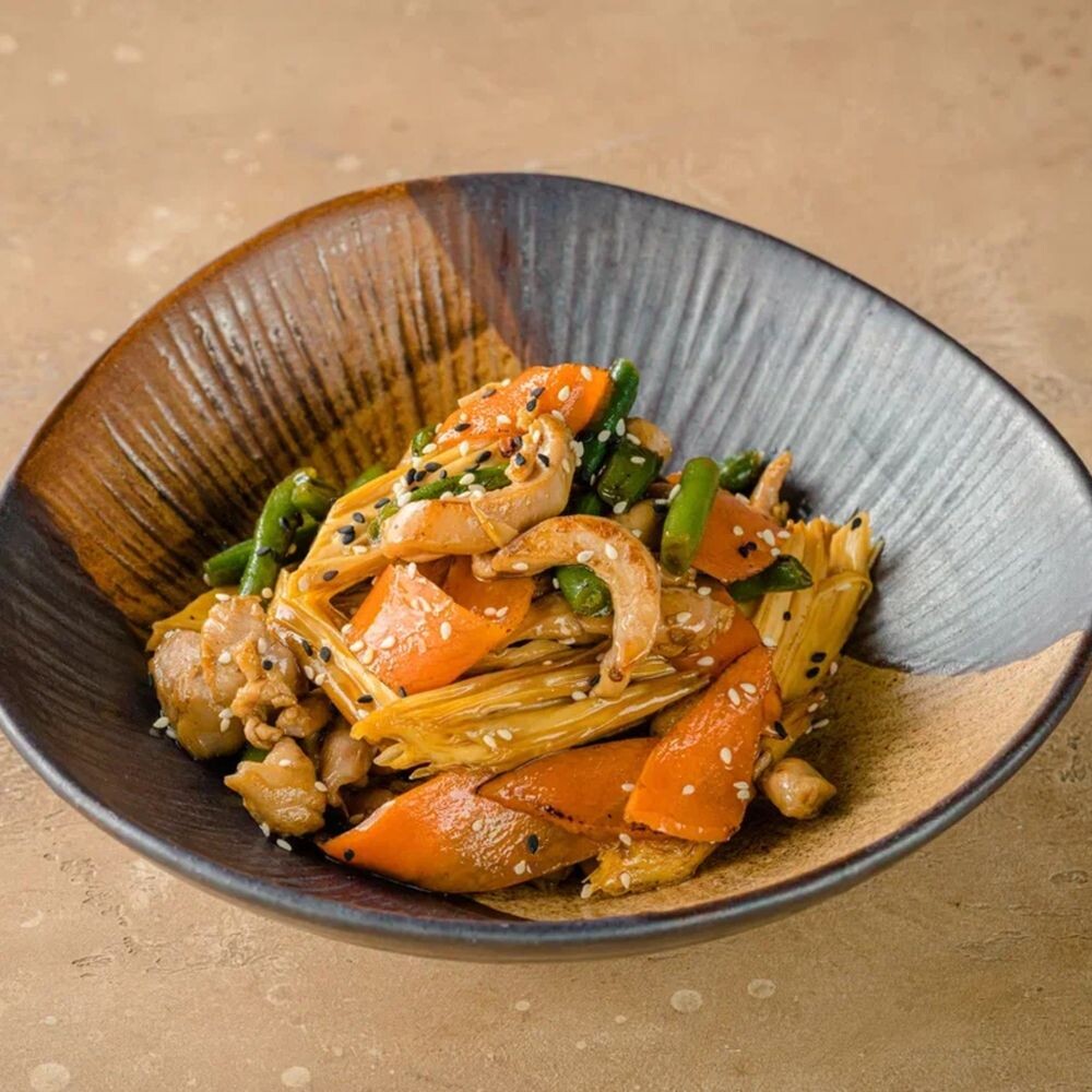 Филе куриного бедра, соевая спаржа, морковь, стручковая фасоль, соус терияки