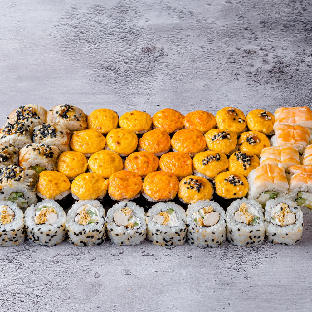 Запеченный с копченой курицей; Запеченный с сурими и тобико; Запеченный с окунем и соусом терияки; Филадельфия с угрем; Филадельфия с креветкой; Осака (48 шт).