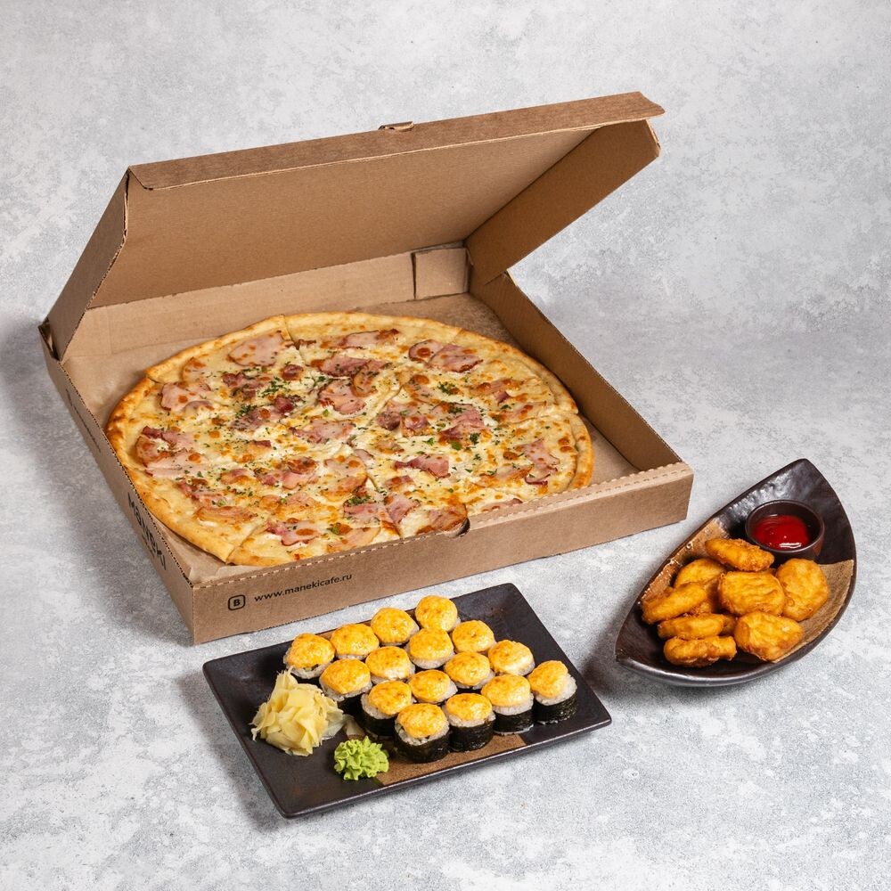 -Пицца Карбонара (большая): Сырокопченый бекон, варено-копченый окорок, моцарелла, чесночный соус. Вес 650г. -Запеченный ролл с копченой курицей (2 порции): копченая курица, огурец, соус для запекания. Вес 370г. -Наггетсы (10 штук): Вес 225г.