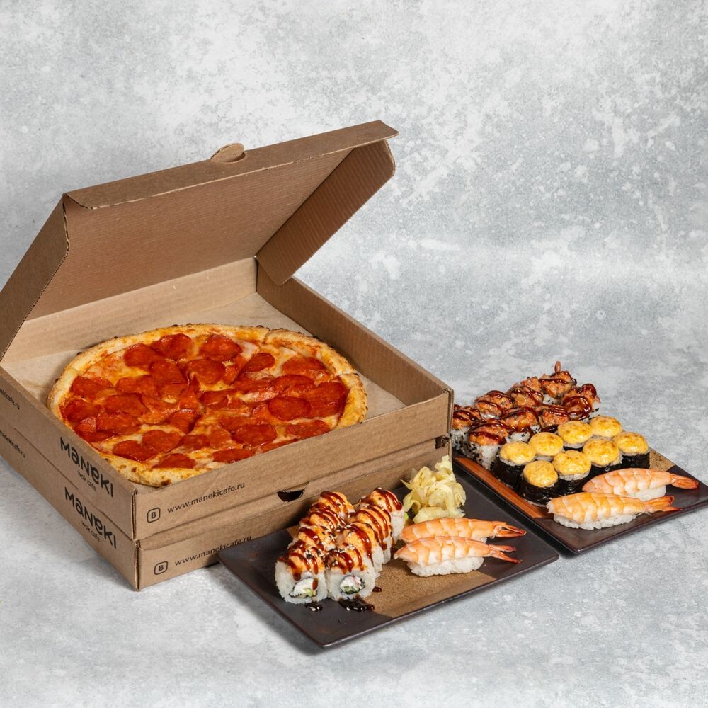 - Пицца Пепперони (средняя): пепперони, сыр моцарелла, соус из протертых томатов, оливковое масло. Вес 530г. -Пицца ветчиной и шампиньонами (средняя): Ветчина, шампиньоны, сыр моцарелла, соус из протертых томатов, оливковое масло. Вес 600г. Запеченный ролл: -Запеченные сливочные роллы с креветками: Креветки, сурими, огурец, сливочный сыр, соусы: для запекания с тобико, терияки. Вес 240г. - Запеченный ролл с копченой курицей: копченая курица, огурец, соус для запекания. Вес 360г. - Рисутеки: Угорь, манго, тобико, сливочный сыр, авокадо, темпурные хлопья, соусы: спайс, терияки. Вес 195 г. - Суши с креветками (2 порции). Вес 120 г.
