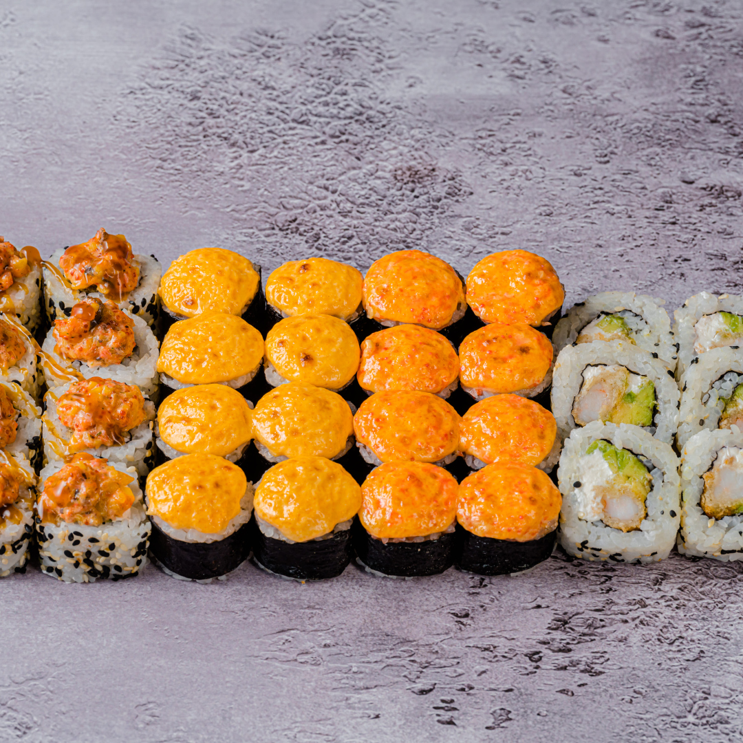 Запеченный с копченой курицей; Запеченный с сурими и тобико; Тоттори с креветой; Рисутеки (30 шт).